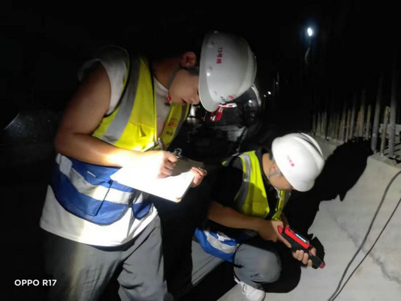 項(xiàng)目經(jīng)理阮超(左一)帶班檢查深入點(diǎn)面、確保將安全、質(zhì)量隱患控制在萌芽狀態(tài)(王澤勛攝影)