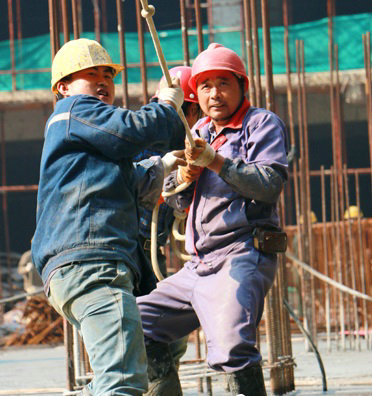結(jié)合,才使我國經(jīng)濟(jì)走上了快速發(fā)展之路,也是“尊重勞動、尊重知識、尊重人才、尊重創(chuàng)造”的精神所在和實質(zhì)表現(xiàn)。如今就有不少農(nóng)民工自豪地說:“只要掌握技術(shù),有絕活兒,就不愁沒活兒干。”在我們項目上有位叫彭兆陽的農(nóng)民工師傅說:“我從十七歲開始學(xué)習(xí)電工電焊,開鉆機(jī)和機(jī)械修理,快二十年了,一個月掙四五千元很正常,干得好老板還會漲點(diǎn)工資,年底另有獎金。”下面是筆者無意間從佛山市華陽特大橋建設(shè)工地上,用數(shù)碼相機(jī)拍攝到的農(nóng)民工工作照,你能說這些農(nóng)民工兄弟不是人才嗎?