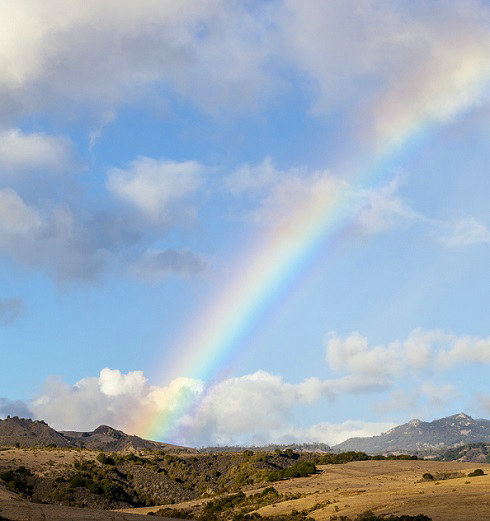 夕陽(yáng)映照彩虹飛,山嵐繚繞天山巍。