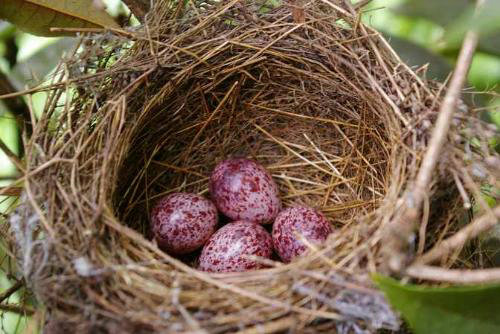 家鄉(xiāng)駝梁山森林覆蓋率高,自然環(huán)境好,適宜多種動物繁衍生息。初夏是喜鵲、麻雀、野雞等各類飛禽繁殖的高峰期,所以它們未等天氣轉(zhuǎn)暖便開始在高大的樹上和草叢里的隱蔽處筑巢,為繁衍后代提供安穩(wěn)、舒適的條件。我們村里的男孩子,對樹上、灌木叢里的鳥窩很感興趣,都想從窩里掏幾個鳥蛋,回家炒著吃。樹上的鳥窩一般專屬喜鵲和老鷹,外形比籃球大,暴露在光天化日之下,數(shù)百米、一兩公里外便可看到。它們以為人類沒有其飛翔的本領,所以很自信地在松樹、楊樹或者樺樹的樹冠上建家,過上安穩(wěn)的日子,殊不知,它們太天真,醒目的巢穴容易被人類或者別的物種光顧,遭遇厄運在所難免,做媽媽的夢想破滅。喜鵲、鷹建造一座房子需要幾個月時間,比人類蓋房還要辛苦。人們發(fā)現(xiàn)哪棵樹上有鳥窩,大孩子們便爭先恐后地往樹上爬,即使衣服被樹皮劃破,挨大人一頓打罵也不在乎,只要能弄到鳥蛋。這種帶有野性的頑皮,山里孩子身上普遍存在。當然樹上掏鳥蛋不是每回都那么幸運,因為天敵太多,有鳥窩便有不速之客造訪,捷足先登者為勝。有一次村里一個大孩子興致勃勃地爬到后山的一棵樺樹上掏鳥蛋,以為勝利的果實即將到手,準備伸手進去時,先瞪大眼睛窺探了一下里面,嚇得大驚失色,尿了一褲子,連屁都放出來了!里面竟然盤著一條大蛇,正朝著他張望呢!這個意外嚇壞了許多想掏鳥蛋的孩子,后來沒人敢上樹掏鳥蛋了,喜鵲和鷹過上了安穩(wěn)日子。