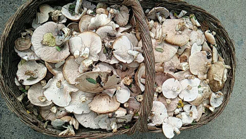 家鄉(xiāng)的駝梁山,自然資源豐富,多年來,鄉(xiāng)親們依靠資源改善貧窮的生活現(xiàn)狀。野生蘑菇是山里常見的一種山珍,備受人們的青睞。野生蘑菇又稱野生菌,種類多,白銀盤、紅銀盤、香心、羊眼、華林、雞腿、地雞、地花等等。每年的8月上旬到9月上旬,是野生蘑菇生長的季節(jié)。駝梁山地區(qū)上半年雨水少,下半年雨水多。松、樺、楊、柳等叢林間年復一年,積淀了厚厚的落葉,在充足的雨水浸潤下,下面的腐爛后變成黑色的泥土,上面是近兩年落的葉子。由樹葉蛻變的泥土,適宜自然生長菌類植物,不同的樹林生長著不同的蘑菇。五六年以前,人們還沒意識到野生蘑菇有抗癌、降壓、長壽等功效,所以山里的蘑菇基本都是村里人去采,吃獨食,哪一家院子里都晾曬著一大片蘑菇,被晾干的蘑菇總有一二十斤,送親友、炒菜、燉菜、蘑菇炒面、賣錢等等,都能派上用場,沒覺得有什么可貴之處。我在家鄉(xiāng)生活16年,大概七八歲起,到了野生蘑菇收獲的季節(jié),便跟著大人或與哥哥姐姐們一道進山里采,有時一個上午便能采到幾十斤。蘑菇味道鮮美,10多米外便能嗅到其獨特的香味。下雨天蘑菇長得快,今天林中看不到蘑菇的蹤影,一場夜雨便長出10多厘米高的蘑菇,他們排成曲曲彎彎的一兩米、兩三米長的陣形,像打傘的一群孩子,十分可愛。所以村