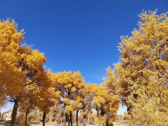 沙雅縣的胡楊林,坐落之處,有沙有水,散落在賴以生存的塔里木河兩岸。一半在土里安詳,一半在風(fēng)里飛揚(yáng),一半澆灌陰涼,一半沐浴陽(yáng)光。從空中看,它像一個(gè)個(gè)蘑菇散落在大地,又像一朵朵云彩來(lái)到人間,深秋時(shí)節(jié)展現(xiàn)在眼前的是一片金色的海洋。誠(chéng)如詩(shī)人所言,“極目金黃千里秀,自成一景閱滄桑”,這宏偉壯觀的色彩盛宴使人震撼不已,令人流連忘返。