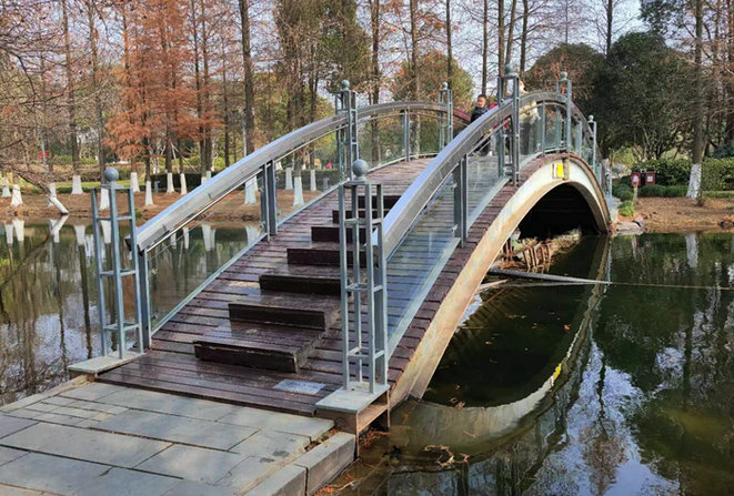 今年春天到冬天,我時常游走于寧波市區(qū)的各大公園。公園里的一景一物,我把圖片和視頻放進電腦里,寫入筆記本,留存在大腦。稍微留意一點會發(fā)現(xiàn)一個有趣的現(xiàn)象:每個公園竟然都有橋,這些大大小小、造型各異的橋給我留下深刻的印記。春天我去東部新城生態(tài)走廊,這個長廊長9.5公里,從北至南,融合了郊野、城市、田園景觀氣息,貫穿南北的優(yōu)美水系,打造了生態(tài)環(huán)境多樣的城市綠道系統(tǒng),凸顯了現(xiàn)代化新城的江南水鄉(xiāng)特色。有水就有橋,幾百米長廊便會有一座橋,從東到西連接兩邊的步道方便游人觀光。設計師根據(jù)地形因地制宜設計每座橋。他們的大小不同,形態(tài)各異,材質(zhì)也不盡相同。石拱橋、木橋、鋼棧橋座座都像是藝術品,橫跨在水面上的橋,