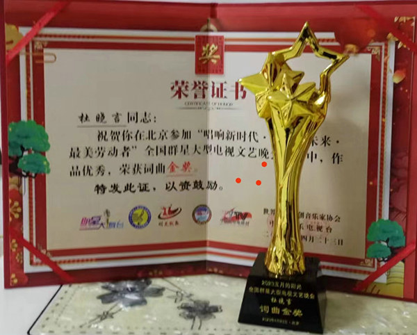 2023年4月23日,在中國(guó)音樂(lè)電視臺(tái)主辦的“唱響新時(shí)代 展望新未來(lái) 最美勞動(dòng)者”全國(guó)群星電視文藝晚會(huì)活動(dòng)中,由杜曉言作詞、蒙古族著名作曲家哈斯雅托嘎作曲、新疆建設(shè)兵團(tuán)著名歌唱家雅麗演唱的《祖國(guó),我為你自豪》榮獲金獎(jiǎng)。近期在《海南衛(wèi)視》、騰訊音樂(lè)、酷狗音樂(lè)等音樂(lè)媒體熱播。