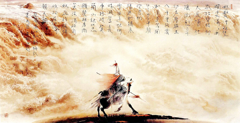 靖康恥,猶未雪。臣子恨,何時(shí)滅。駕長(zhǎng)車,踏破賀蘭山缺。壯志饑餐胡虜肉,笑談渴飲匈奴血。待從頭、收拾舊山河,朝天闕。