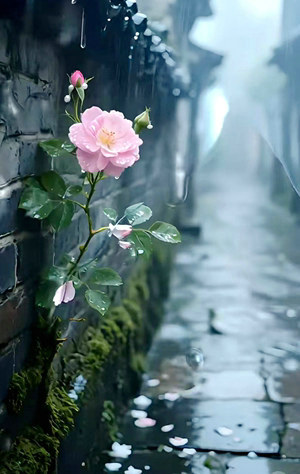 凸顯雨中屋檐下?lián)伍_(kāi)粉色清幽