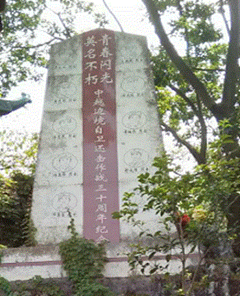 位于通山縣城南鳳池山森林公園的進(jìn)入大門不遠(yuǎn)處,在四面綠蔭環(huán)繞之中,矗立著一座《青春閃光 英名不朽-中越邊境自衛(wèi)還擊作戰(zhàn)三十周年紀(jì)念》碑。在碑文兩側(cè)雕刻有當(dāng)年(1979年二月)在戰(zhàn)火中英勇獻(xiàn)身的十位烈士浮雕像與姓名,并在紀(jì)念碑前的臺階兩邊另立有各位烈士的戰(zhàn)功簡介與入伍前的出生地和當(dāng)時所在參戰(zhàn)部隊(duì)的番號。他們都是1978年春季入伍的通山兵,是我們的同年戰(zhàn)友,不同處我們是當(dāng)年冬季入伍的通山兵。在一年中能出現(xiàn)春冬二季兩次征兵,這在建國后的人民軍隊(duì)建軍史上也是很少見的。一般多是在國防邊境受到外敵挑釁或入侵告急時,戰(zhàn)事處在極度緊張狀態(tài)下才會有。