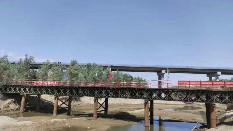 鋼棧橋全長60米,采用上承式結(jié)構(gòu),由貝雷梁、型鋼分配梁、橋面板及鋼管樁基礎(chǔ)組成,設(shè)計最大承載能力120t,由南向北橫跨葉爾羌河,是重要的臨時性過渡通道。鋼棧橋的建設(shè)完成,為項目施工的主要材料和設(shè)備運(yùn)輸通道提供了保障,縮短了施工材料、機(jī)械設(shè)備運(yùn)輸距離近。